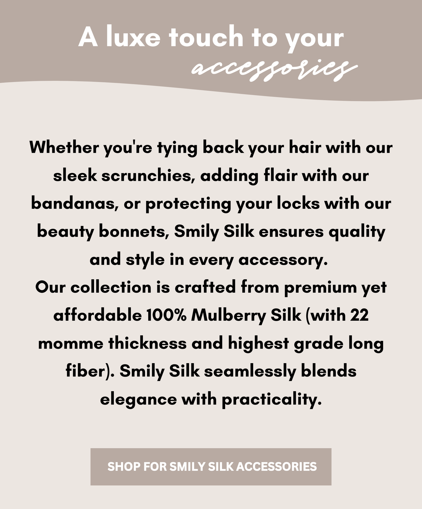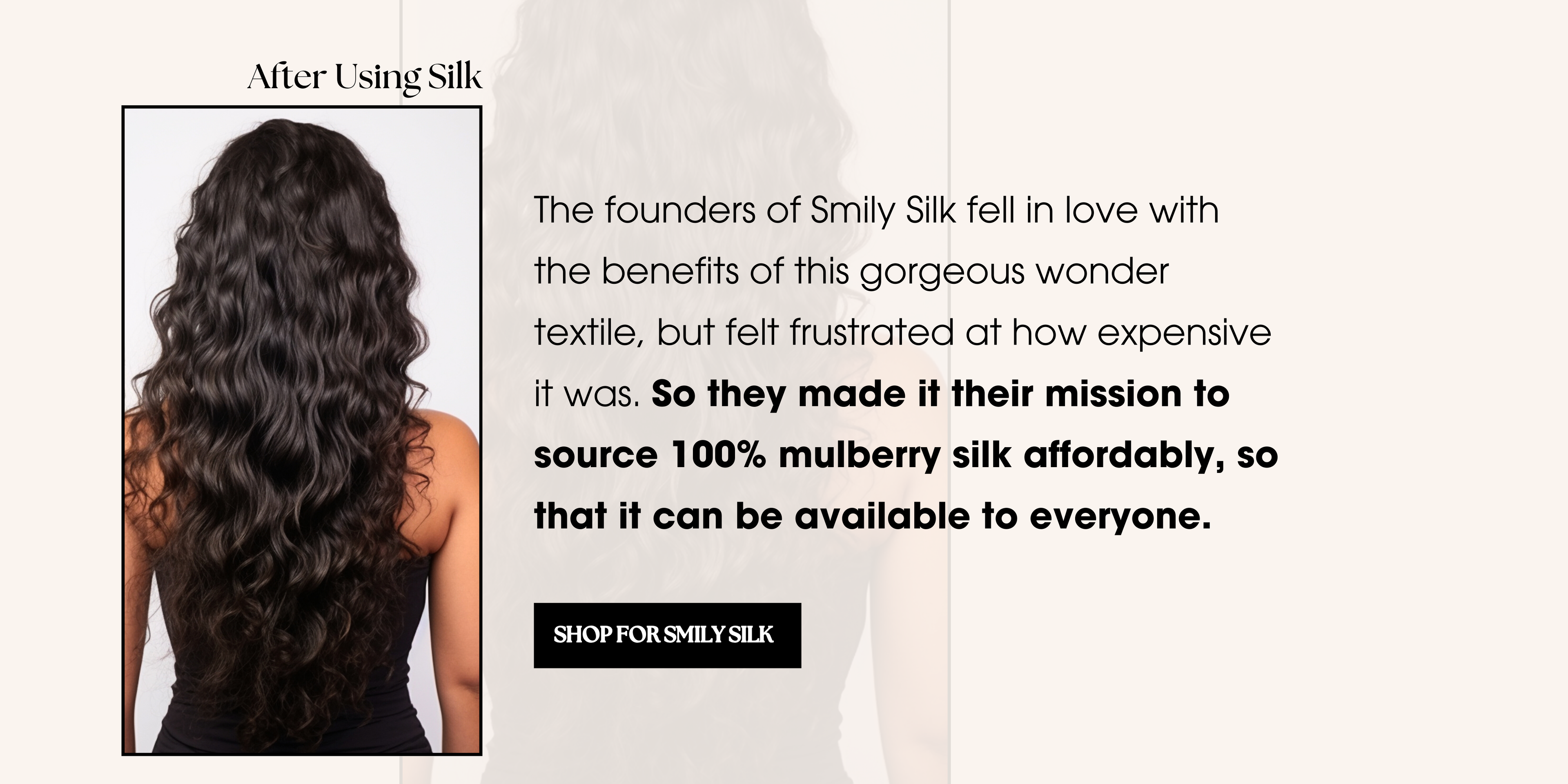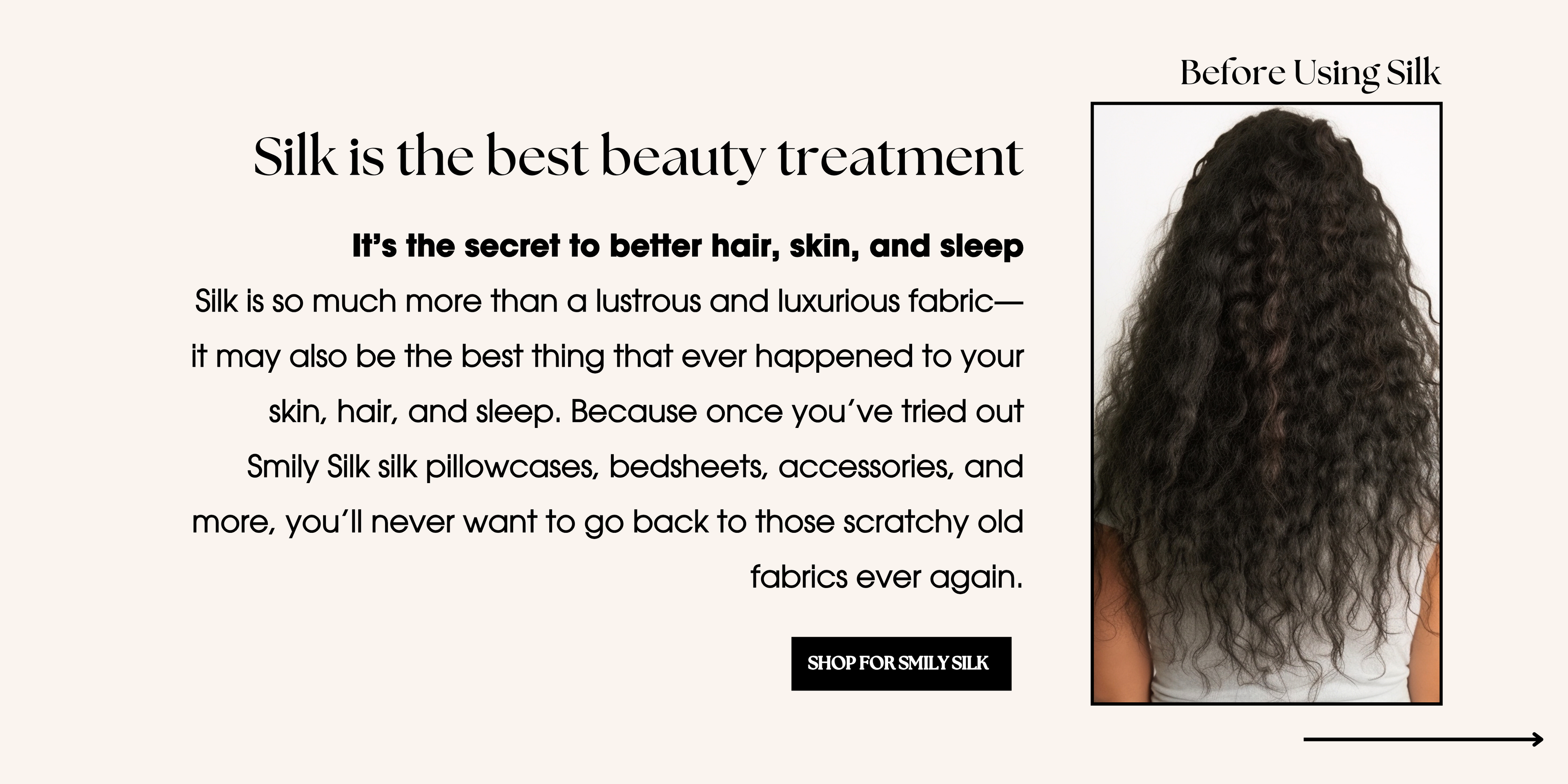 Silk’s soft, smooth, and strong texture mean that no fabric can compete with it as far as bedding and hair accessories go. Our Smily Silk is tightly woven meaning its fibers are smoother, so it won’t drain moisture from your skin while you sleep (unlike cotton pillowcases which can make your skin drier).